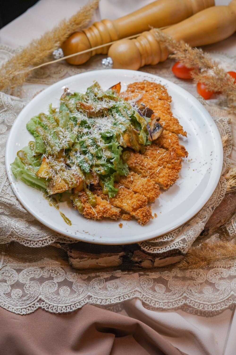 Нежный салат с хрустящими кусочками жареного куриного шницеля, посыпанный свежим пармезаном и украшенный ароматным соусом из кориандра. Идеальное сочетание текстур и насыщенных вкусов для любителей изысканных блюд