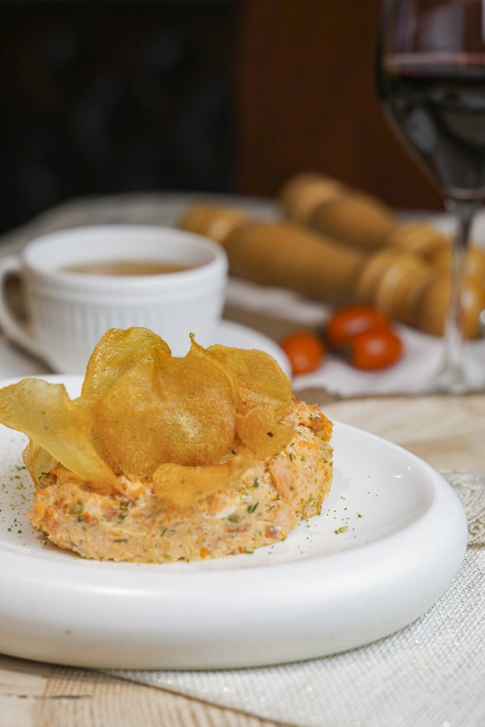 Нежный дуэт слабосоленой форели, творожного сыра, пикантных вяленых томатов и солоноватых каперсов. Подается с картофельными чипсами