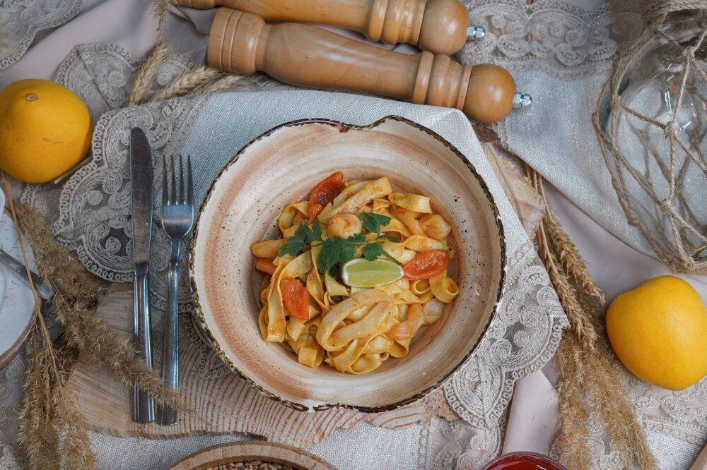 Классическая итальянская паста с сочными морепродуктами в насыщенном соусе Биск, дополненная свежими томатами. Ароматное сочетание морской свежести, богатого соуса и яркости помидоров создаёт изысканное и аппетитное блюдо для ценителей морской кухни