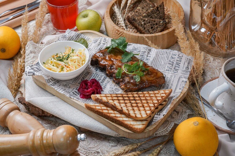 Невероятно нежные свиные ребра, томленные при низкой температуре с добавлением свежих апельсинов и ароматных трав (розмарин, тимьян). Мясо буквально тает во рту, а цитрусовая глазурь придает блюду изысканную сладость и свежесть. Подается с классическим освежающим салатом Коул Слоу, маринованными овощами и ломтиками свежего хлеба