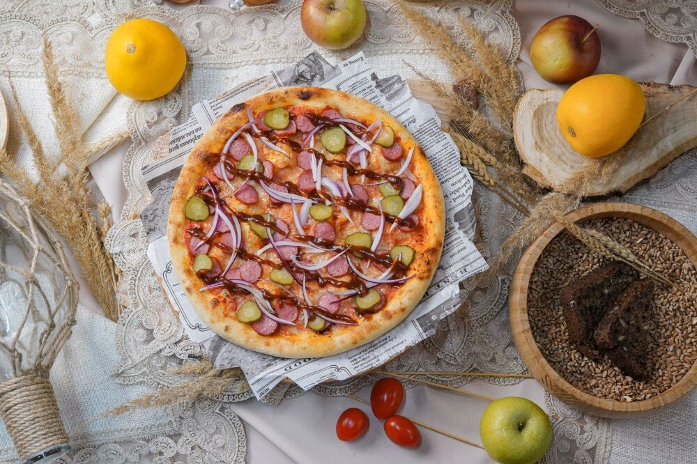 Пицца с колбасками и маринованными огурцами