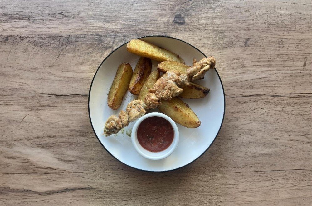 Нежное куриное бедро зажаренное на гриле до золотистой корочки и сочности внутри. Подается с классическим запеченным картофелем Айдахо и томатным соусом