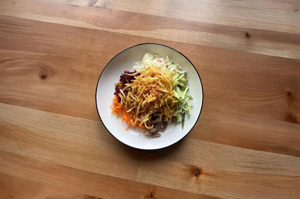 Многослойный вкус в одной тарелке. Основа — обжаренная в специях соломка говядины. Её дополняют: острая морковь «по-корейски» для пикантности, свежий огурец для хруста и лёгкости, и маринованная свекла для сладкой кислинки.