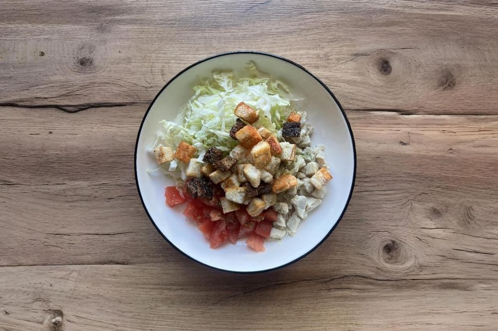 Свежий и хрустящий салат: нежная отварная куриная грудка, сочные помидоры, легкая пекинская капуста. Заправлен нашим фирменным соусом и посыпан золотистыми сухариками.