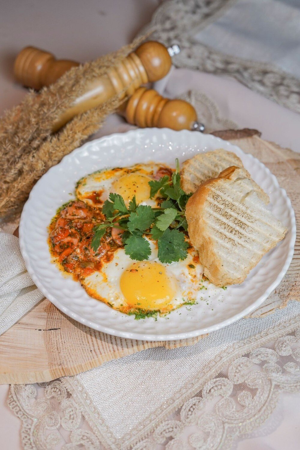 Восхитительное блюдо из насыщенного томатного рагу с сочными сосисками, подается с мягкой и ароматной чиабаттой. Богатый вкус, сытность и уют — идеальное решение для дружеского завтрака или семейного обеда