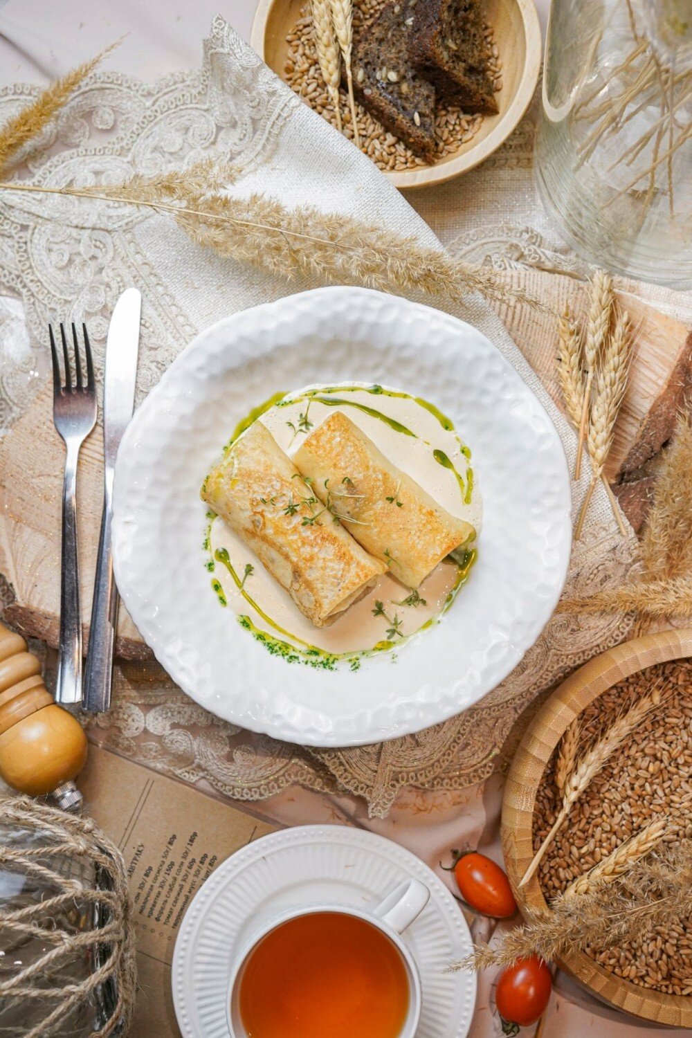 Нежные тонкие блинчики, наполненные сочной рыбой и мягким фаршем, подаются с насыщенным сливочным соусом в азиатском стиле. Идеальное сочетание нежности и ярких вкусов, создающее приятную гармонию для всей семьи