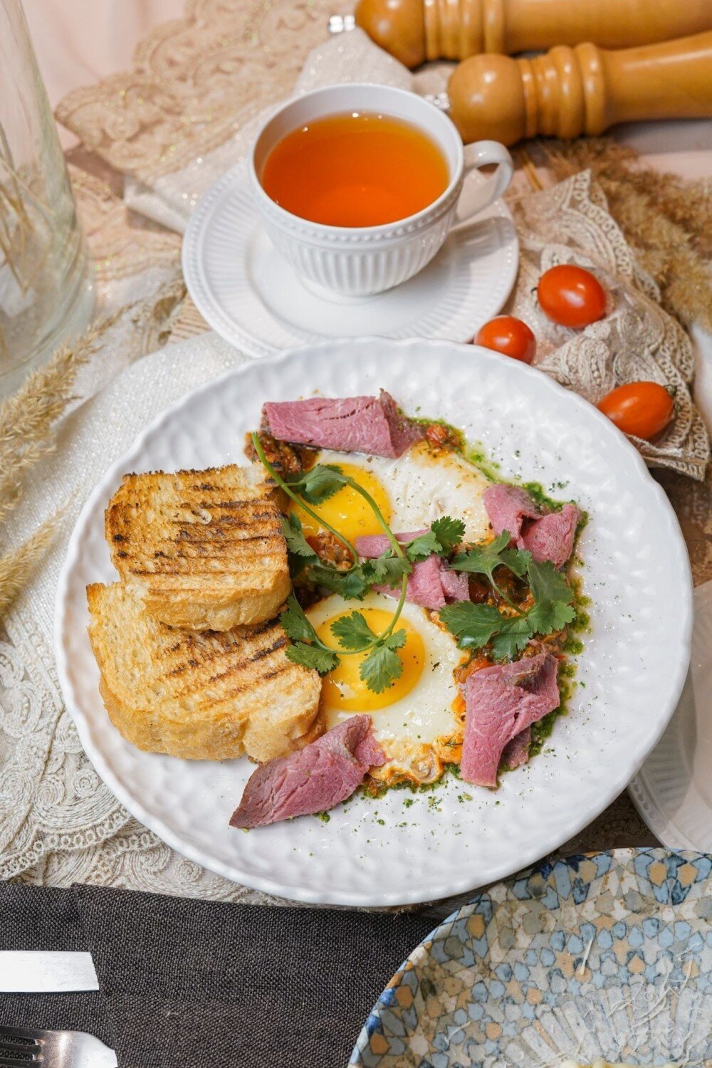 Нежная томатная шакшука с ароматным ростбифом, подается с мягкой и хрустящей чиабаттой. Вкусное и сытное блюдо, сочетающее богатство специй, сочность мяса и аромат свежей выпечки — идеально для завтрака или обеда