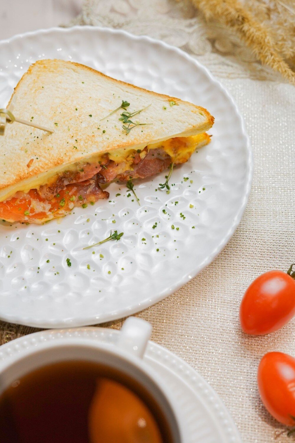 Хрустящий тост из пшеничного хлеба, украшенный сочными свежими томатами и ароматным, слегка поджаренным беконом. Идеальное сочетание вкусов для легкого завтрака или вкусного перекуса в уютной атмосфере нашего кафе