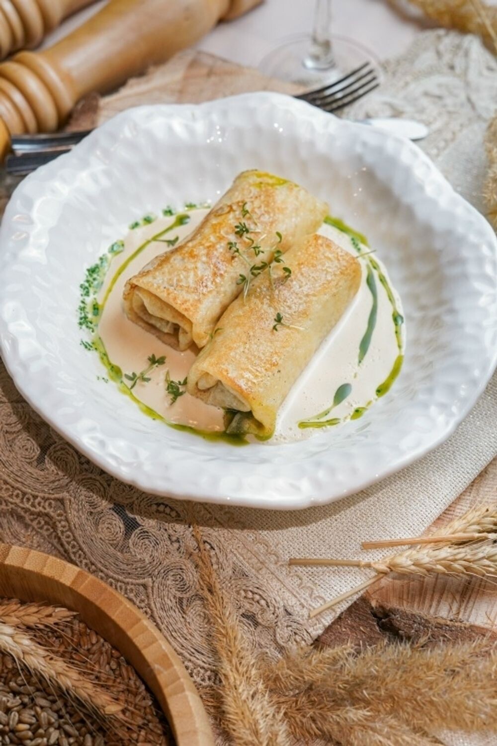 Нежные тонкие блинчики, наполненные сочной рыбой и мягким фаршем, подаются с насыщенным сливочным соусом в азиатском стиле. Идеальное сочетание нежности и ярких вкусов, создающее приятную гармонию для всей семьи