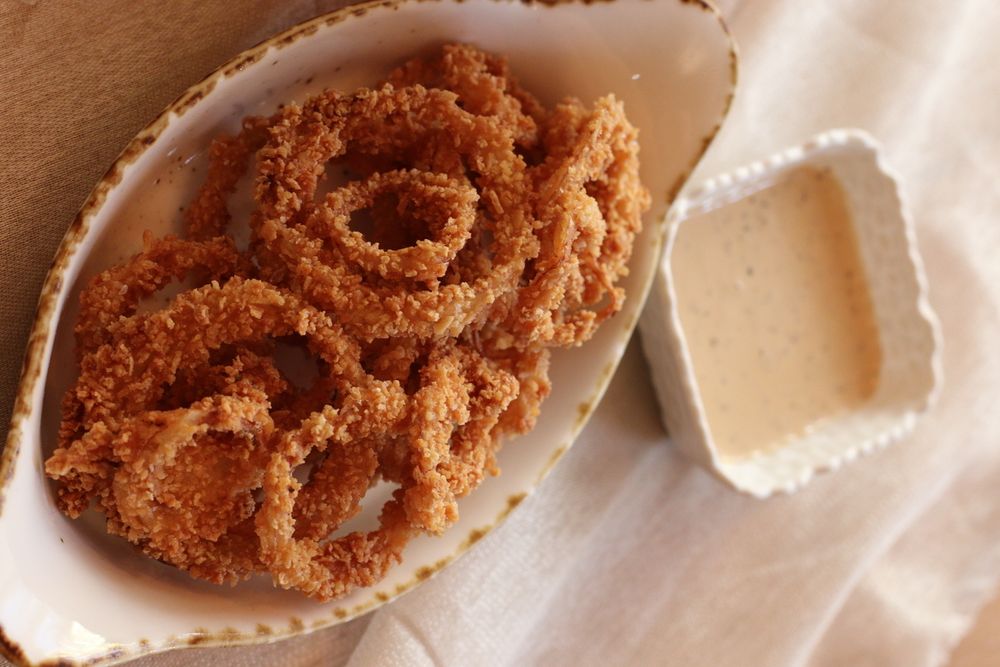Луковые кольца с ореховым соусом