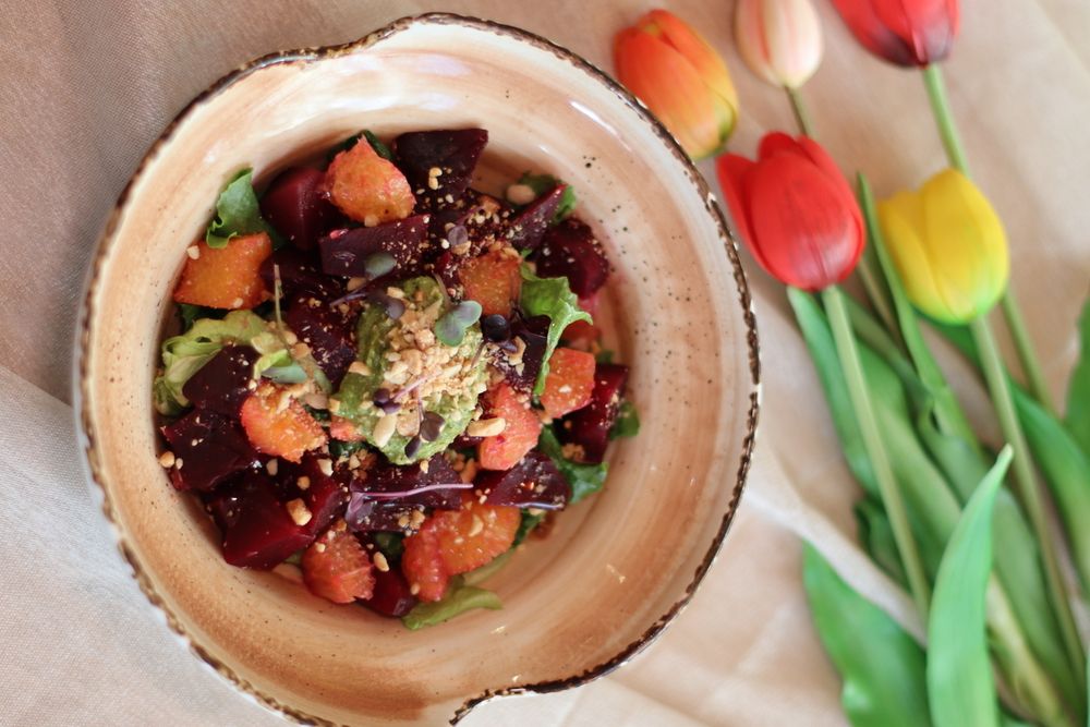 Микс салата/ свекла печеная/ апельсин /песто / арахис