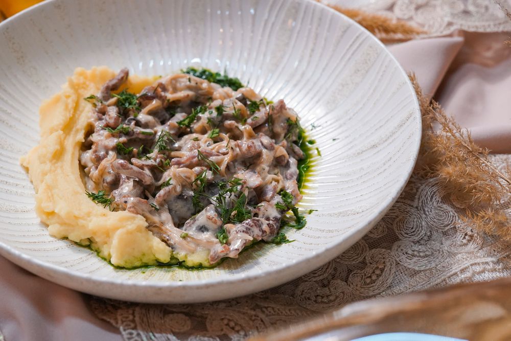 Строганов из телятины с картофельным кремом