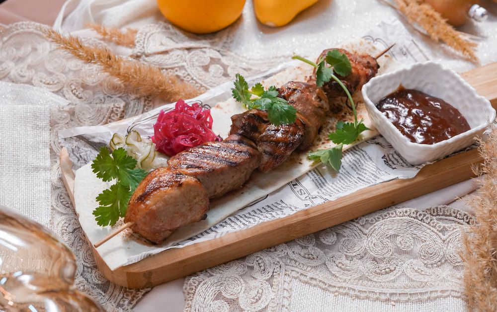 Классическое блюдо с гриля- шашлык из свинины. Подается с маринованным луком и томатным соусом