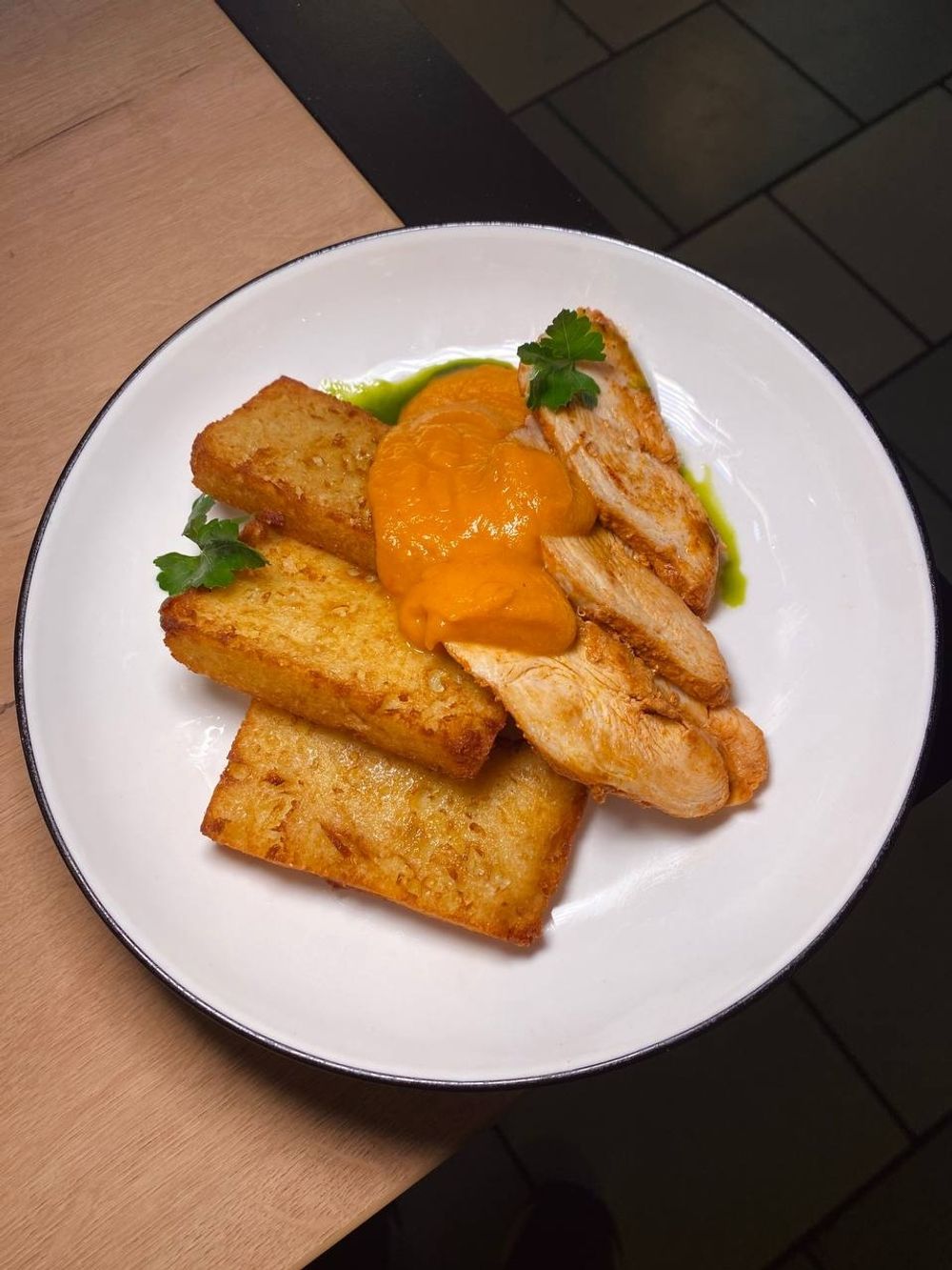 Хрустящий картофельный хашбраун, нежнейший цыпленок, приготовленный методом сувид, и легкая овощная сальса.