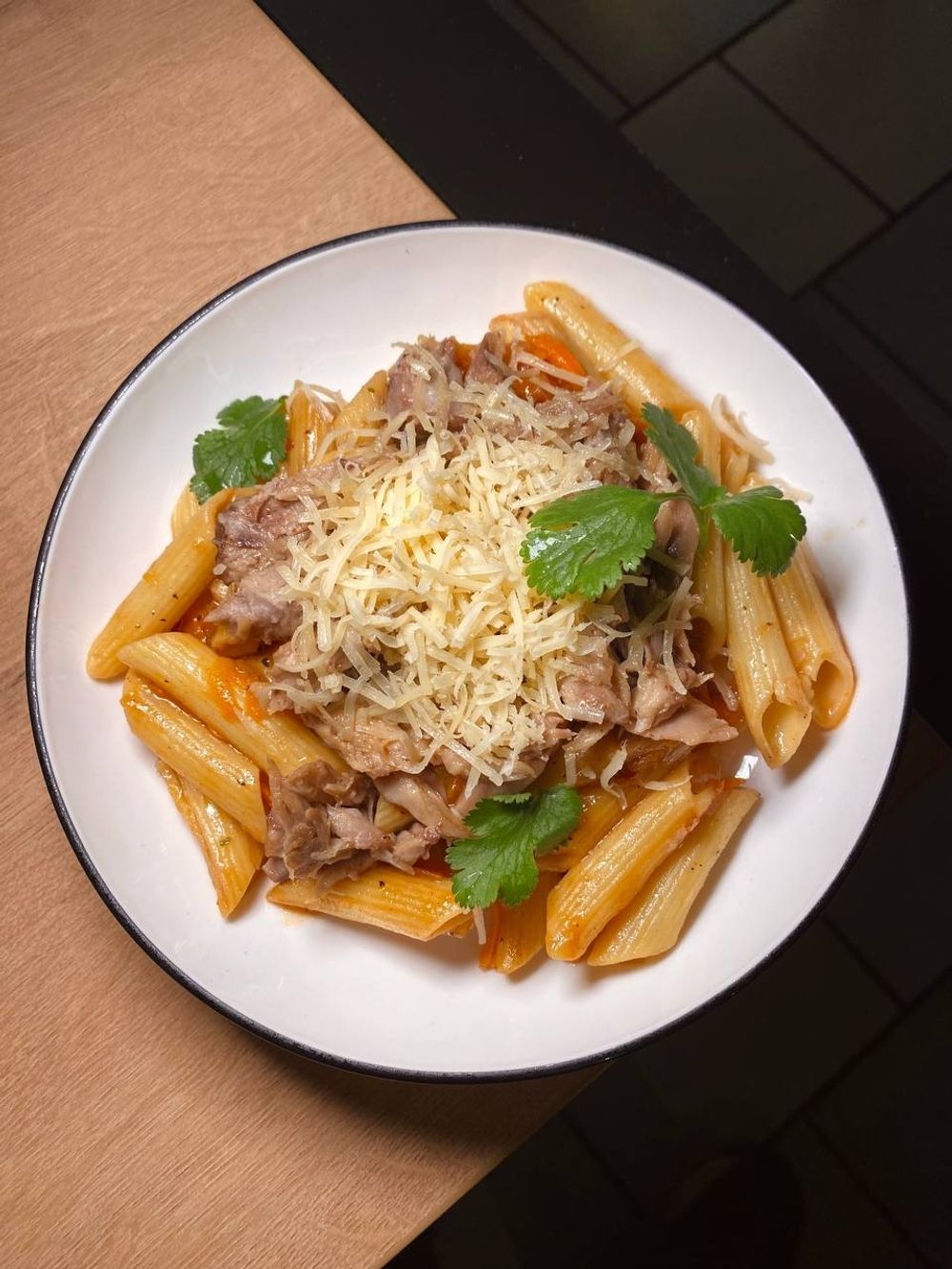 Сытная паста с сочным мясом свиных ребер, тушеным в томатном соусе и овощами.