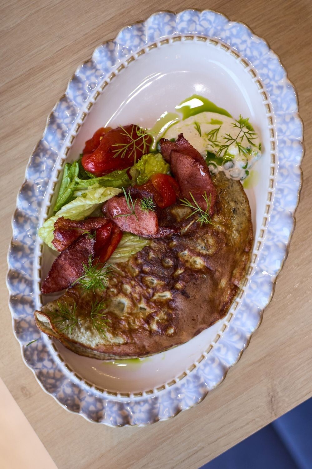 Нежный омлет с ароматом трюфеля, сладкий печеный перец, хрустящая ветчина и сочные горошины в насыщенном сливочном соусе. Гармония вкуса и контраста