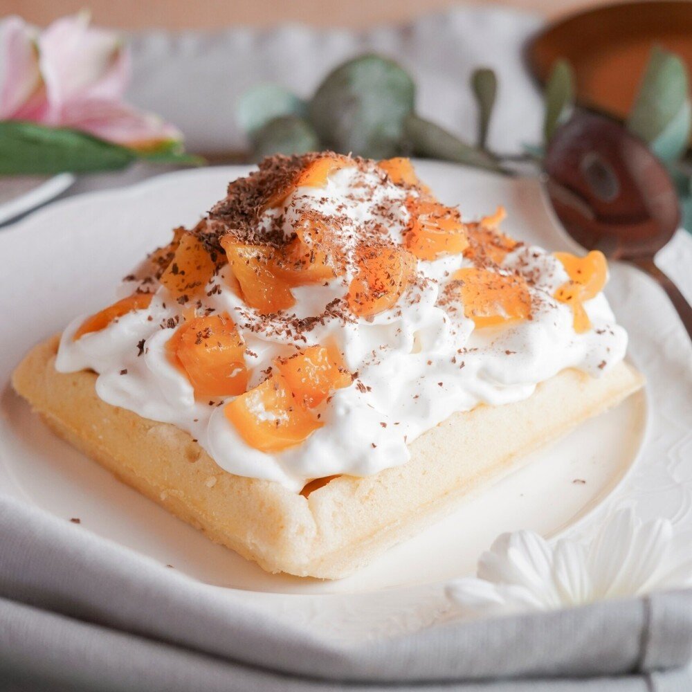 Пышные вафли с персиками и нежным сливочным кремом.