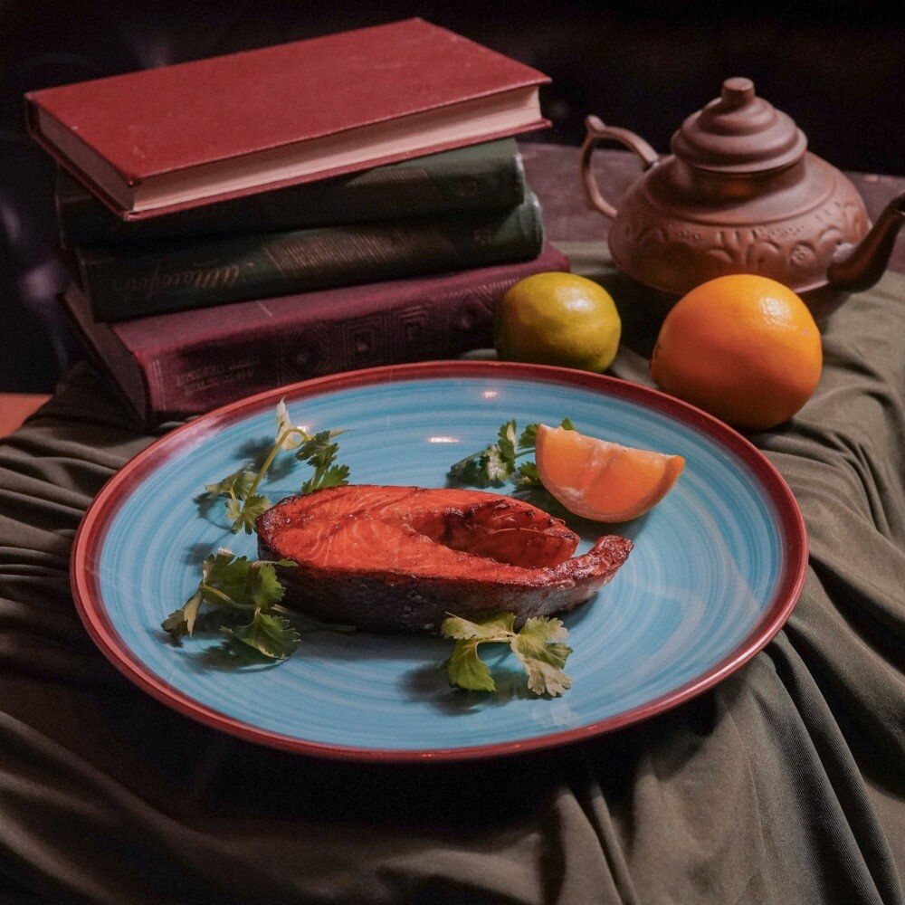 Ароматный и легкий стейк из форели с гриля, подается со свежим лимоном и зеленью
