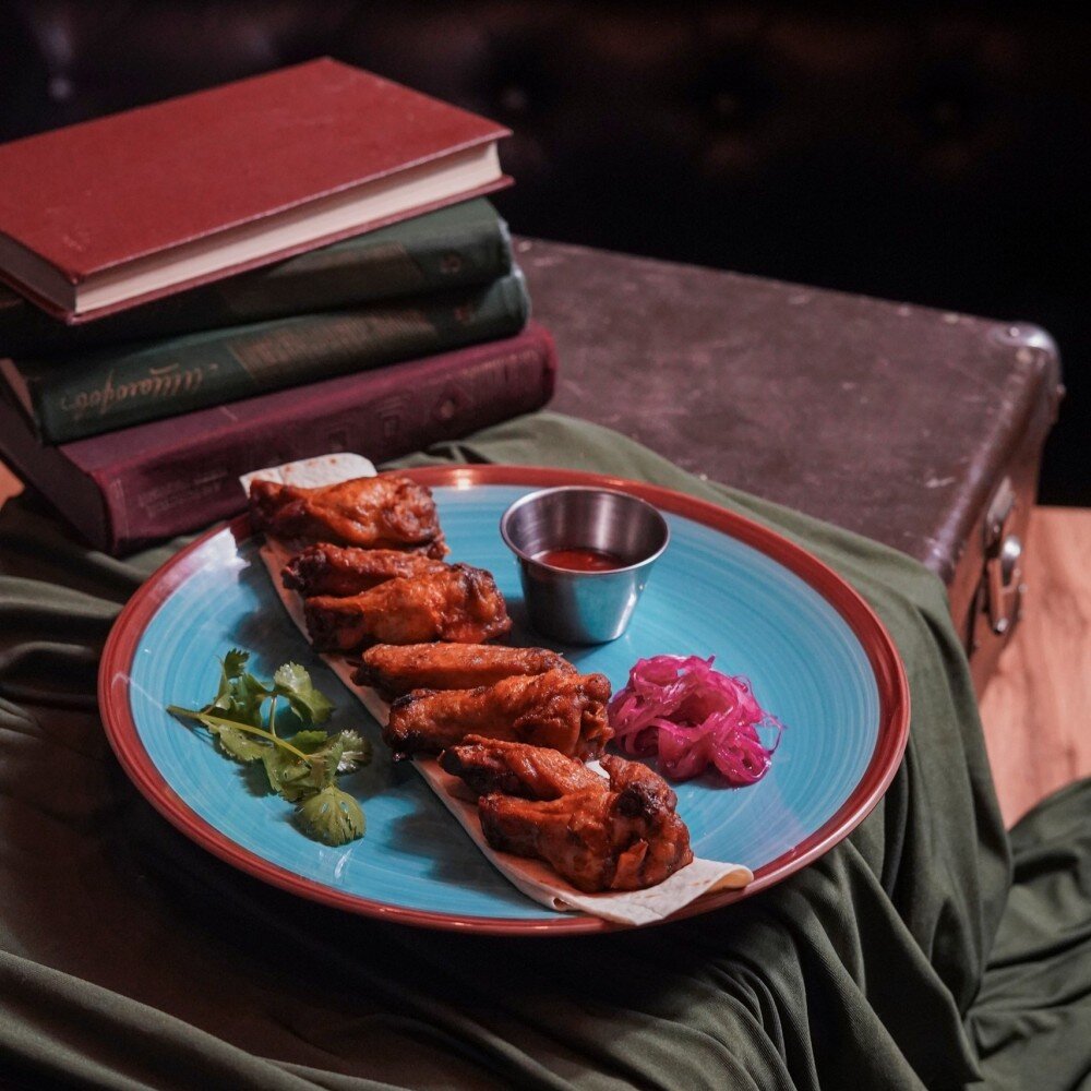 Куриные крылья в пряном маринаде с гриля- идеальный выбор для пенного. Подается с маринованным луком и томатным соусом