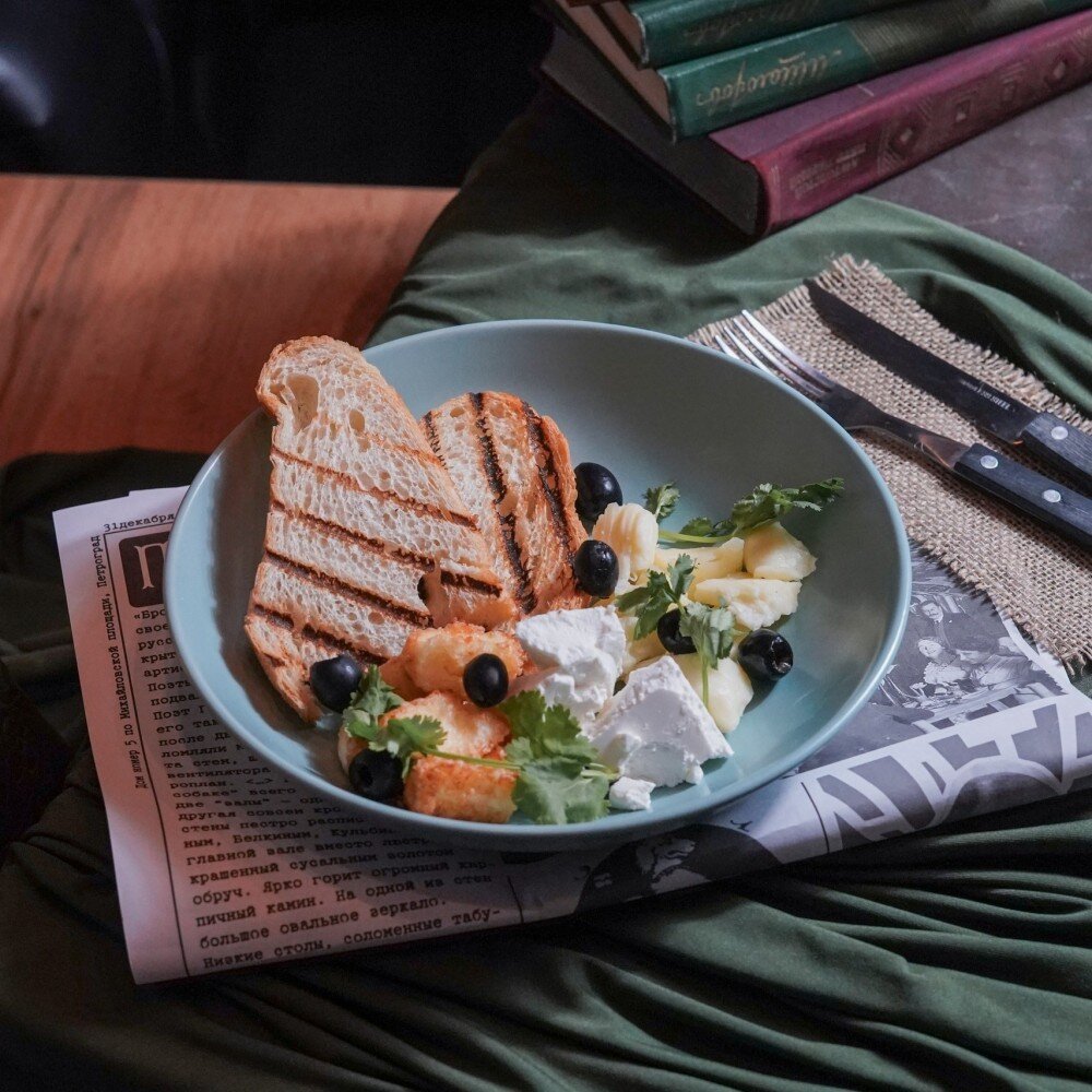 Сулугуни, Адыгейский,Фетакса. Подается с греческими оливами Каламато и обжаренной чиабаттой. Отличное сочетание текстур и вкусов