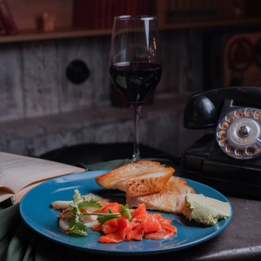 Элегантное сочетание текстур и вкусов. Форель гравлакс с цитрусовыми нотками соседствует с тающей во рту масляной рыбой холодного копчения. В качестве аккомпанемента — нежное взбитое масло с зеленью и румяная чиабатта. Идеальная закуска к белому вину
