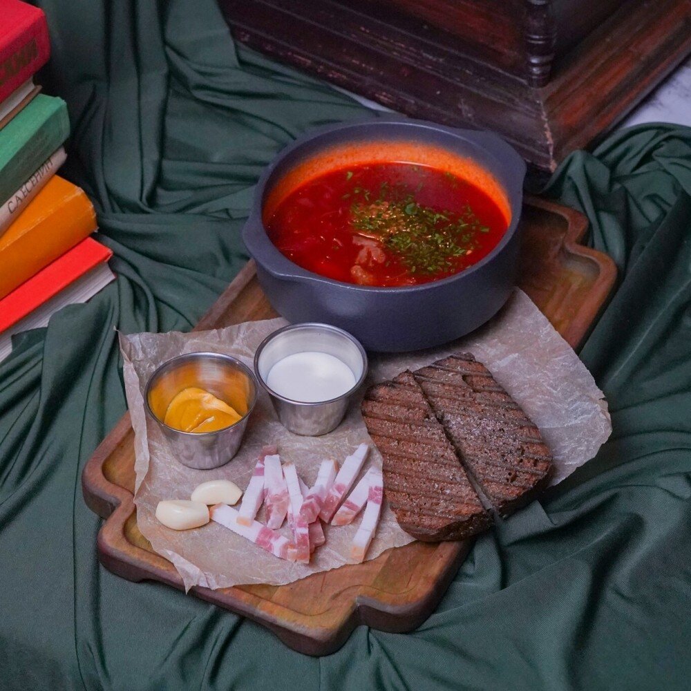Насыщенный свекольный суп с говядиной, нежной капустой, картофелем и морковью. Подается со сметаной, крепкой горчицей и свежей зеленью, создавая идеальный баланс сладости и кислинки