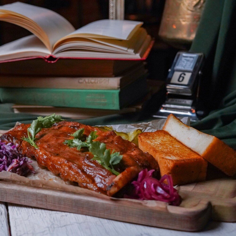 Сочные, тающие во рту свиные ребра, медленно томленные до совершенства. Насыщенный мясной вкус идеально дополняется пикантным, слегка острым соусом Релиш, который придает блюду яркость. В качестве освежающего гарнира — классический хрустящий салат Коул Слоу и свежий хлеб